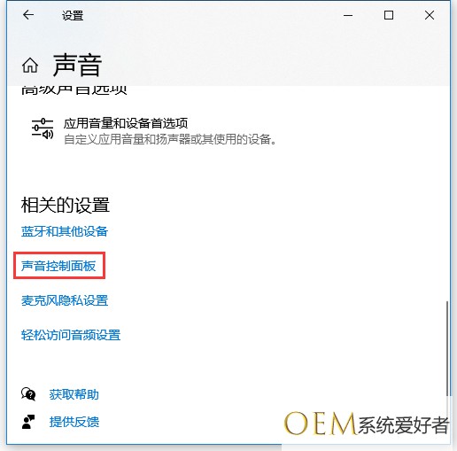 2、声音设置窗口中,点击相关的设置下的声音控制面板;
