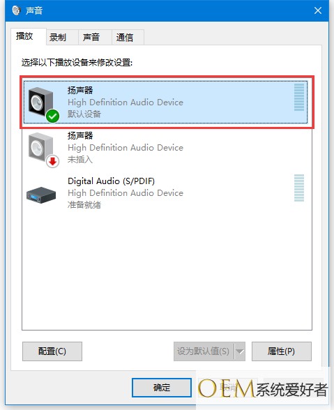 3、声音窗口中,找到并双击开,当前正在使用的扬声器设备;