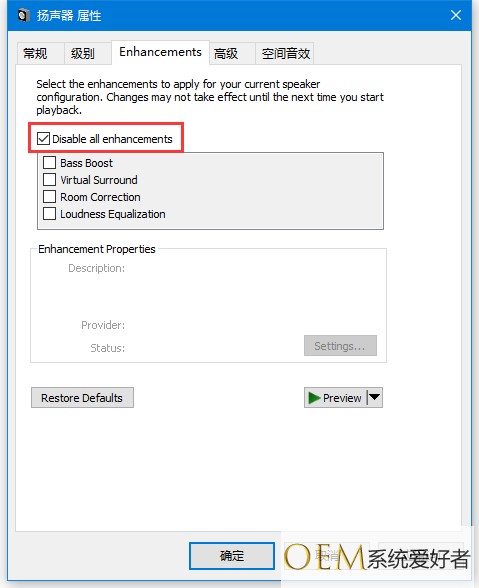 4、扬声器 属性窗口中,切换到Enhancements,在音效增强选项卡下取消勾选所有声音处理,或直接勾选取消所有增效;
