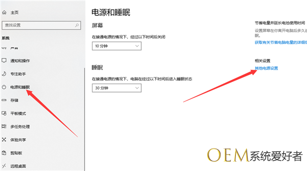 2、找到电源和睡眠,选择其他电源设置。