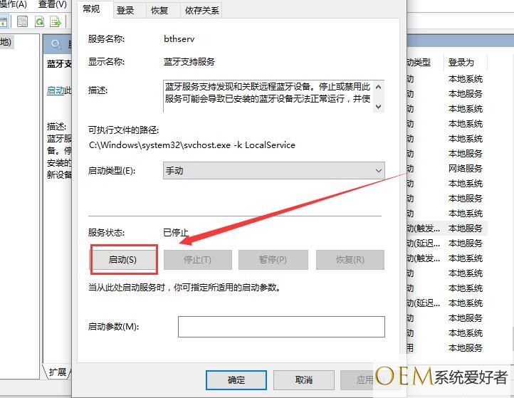 4、双击打开【蓝牙支持服务】,服务状态为已停止,点击【启动】就行了。