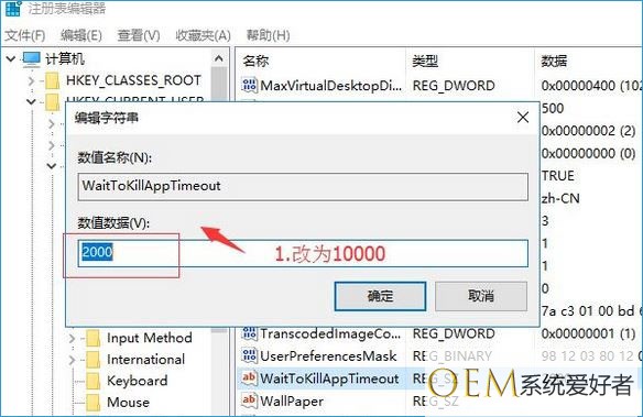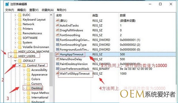 7、参考步骤4~5,将右侧WaitToKillAppTimeOut和HungAppTimeOut数值改为10000 即可!