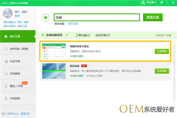 在“360人工服务”中,输入“花屏”关键词,点击右侧的“查找方案”按钮。