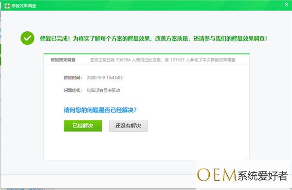 在“修复效果调查”对话框中,显示“修复已完成”字样提示,这样就可以修复玩游戏花屏的问题了。