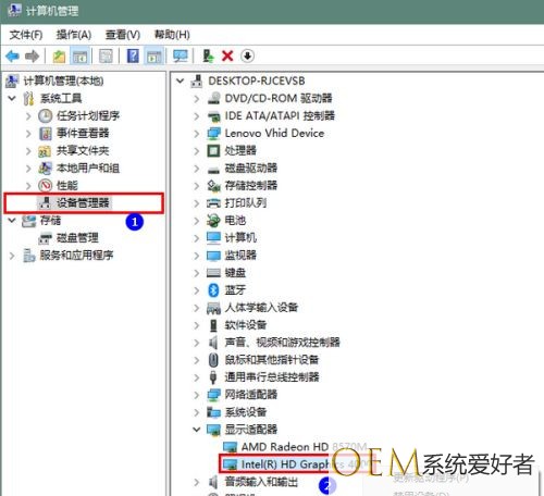 在打开的计算机管理窗口中,先选中“设备管理器”,然后在“显示适配器”一项下找到英特尔核芯显卡,在其上右击鼠标,选择“属性”。