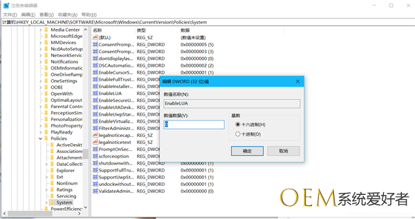 在目录下查找:计算机HKEY_LOCAL_MACHINESOFTWAREMicrosoftWindowsCurrentVersionPoliciesSystem。找到EnableLUA,把数值数据 1 改为 0,点击确定。
