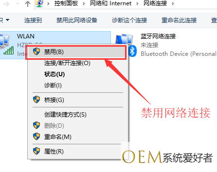 2、在打开的网络连接界面中,找到无线连接“WLAN”,右键单击,并选择“禁用”。