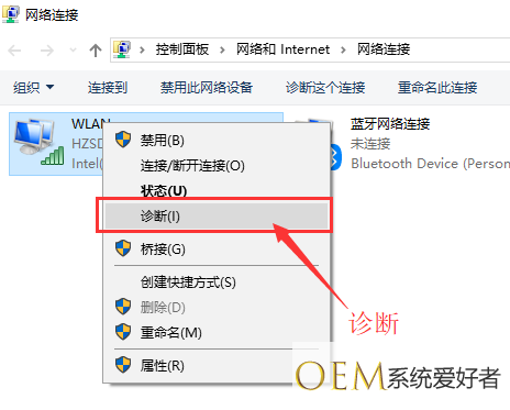在打开的网络连接界面中,找到无线连接“WLAN”,右键单击,并选择“诊断”,当诊断完毕,可以通过尝试修复网络连接。