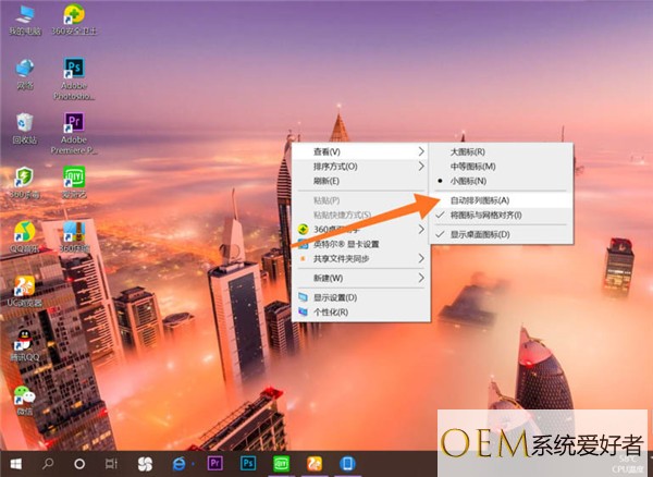 3、我们在点击查看进入以后呢,我们会看到六个选项:大图标、中等图标、小图标、自动排列图标,我们需要点击取消【自动排列图标】哦。这一步就完成啦。