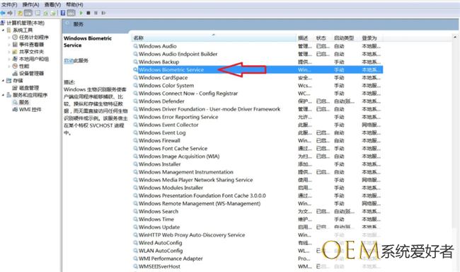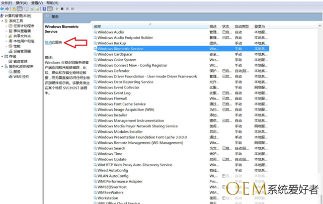 5、选中Windows Biometric Service,选择启动(如图所示),就可开启该服务。