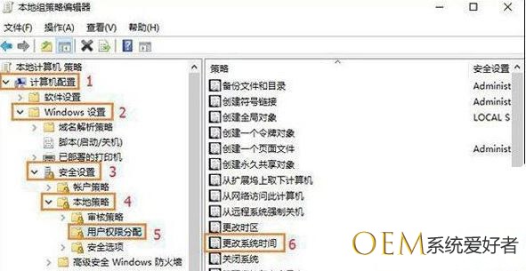 第二步、依次展开“计算机配置—Windows设置—安全设置—本地策略---客户权限分配”,双击右侧窗口中的“更改系统时间”。如下图所示: