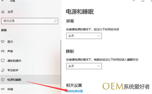3、之后我们再点击左侧的“电源和睡眠”选项,然后点击右侧栏的“其他电源设置”,如下图所示。