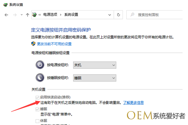 5、最后将关机设置下面的“启用快速启动”前的勾选打上,点击最底部的“保存修改”即可。