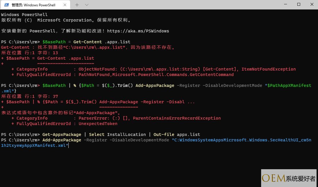 第四句:Add-AppxPackage -Register -DisableDevelopmentMode “C:WindowsSystemAppsMicrosoft.Windows.SecHealthUI_cw5n1h2txyewyAppXManifest.xml”效果图如下: