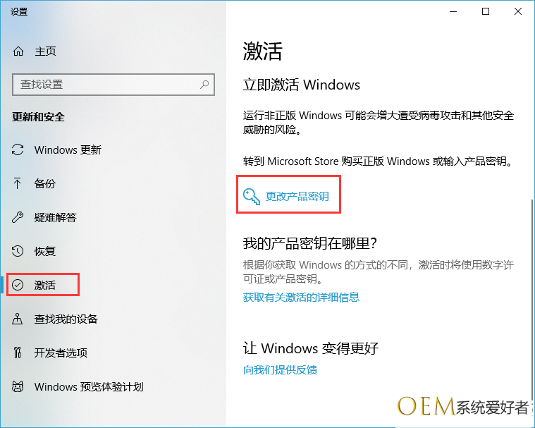 3、在激活设置界面,点击打开“更改产品密钥”;