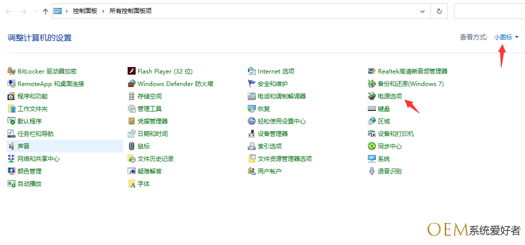 2、设置为小图标查看,再单击电源选项;