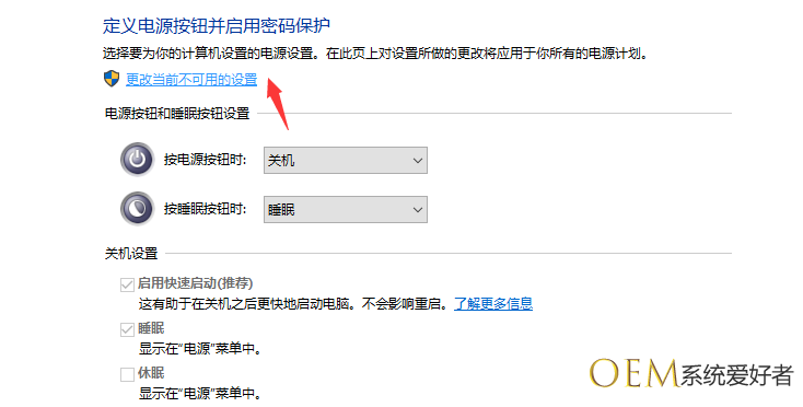 5、下拉右侧滑条,找到关机设置,左键点击:启用快速启动去掉前面小方框内的勾;再点击:保存修改;