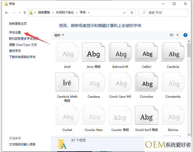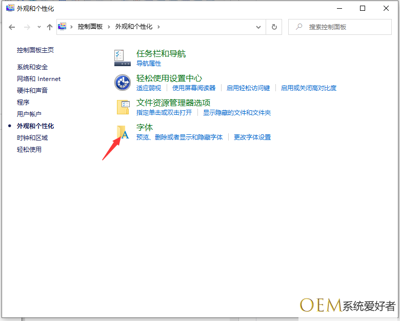2、选择【外观和个性化】,选择【字体】,左侧的字体设置,可以进行相关的设置。