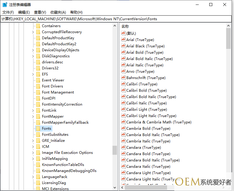 2、定位到这个路径:计算机HKEY_LOCAL_MACHINESOFTWAREMicrosoftWindows NTCurrentVersionFonts。