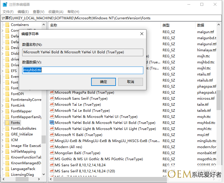 4、再找到Microsoft YaHei Bold & Microsoft YaHei UI Bold(TrueType),把后面的msyhbd.ttc也改为你想要的字体,之后退出重启就OK了。
