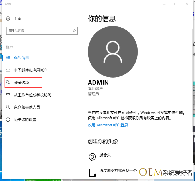2、在出现的账户界面,左边列表栏找到“登陆选项”,点击选择。
