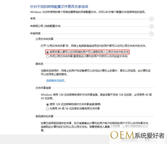 2、在电脑B上依次点击:控制面板 >网络和Internet >网络和共享中心 >高级共享设置 ,勾选“启用共享以便可以访问网路的用户可以读取和写入公用文件夹中的文件 ”,保存更改。