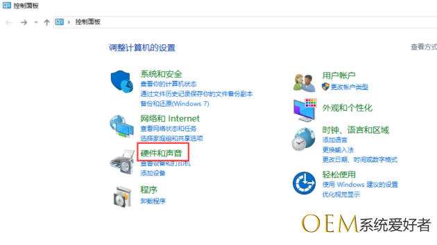 1、首先,打开桌面左下角的“搜索”按钮,在搜索栏中输入“控制面板”回车键,然后在打开的窗口中选择“硬件和声音”。