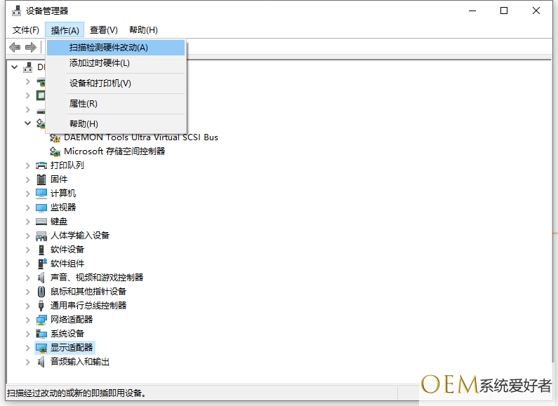 6、点击设备管理器上面的操作--扫描硬件改动。