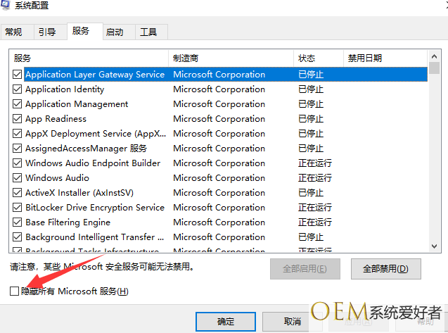 2、win键+r键打开运行,输入msconfig,点击确定。点击服务,勾选“隐藏所有的微软服务”,然后点击【全部禁用】。随后重启电脑。