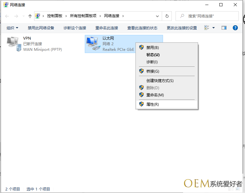 3、右键点击“以太网”或“本地连接”—属性,如果是WIFI就选择无线网络的属性。