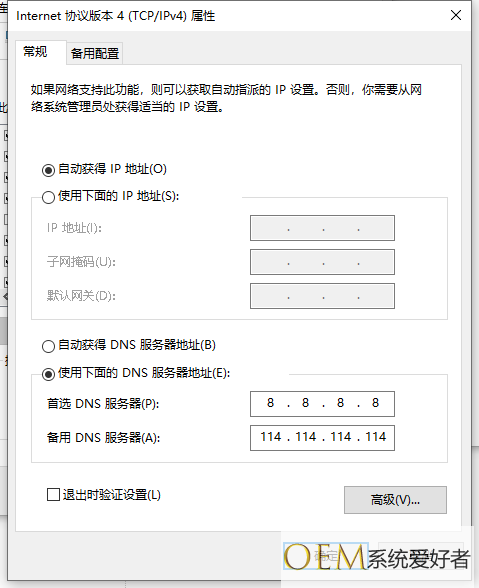 5、选择“使用下面的DNS服务器地址”,输入8.8.8.8,备用DNS服务器可以填上114.114.114.114等,然后点击确定。