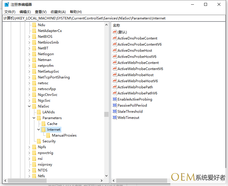 2、找到注册表键值:HKEY_LOCAL_MACHINESYSTEMCurrentControlSetservicesNlaSvcParametersInternet。
