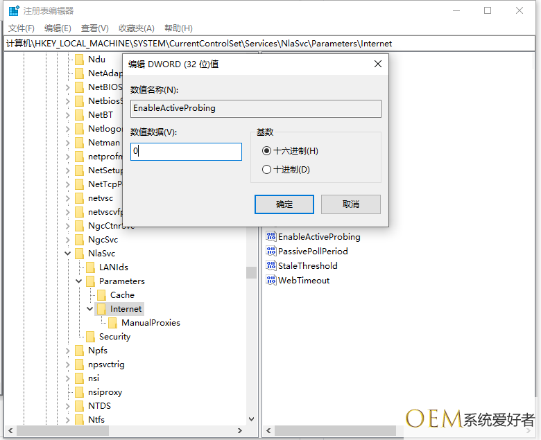 3、双击Internet窗口右侧中的“EnableActiveProbing”,然后将其值更改为0。