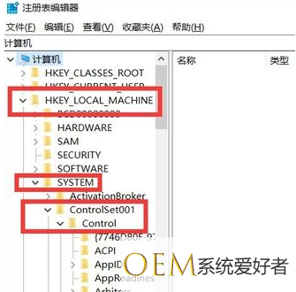 2、进入注册表编辑器后,依次选择HEKY_LOCAL_MACHINE——SYSTEM——ControlSet001——Control;