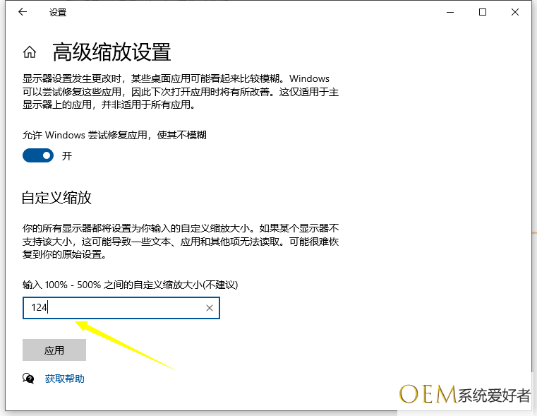 3、在高级缩放页面,输入一个自定义的缩放大小【124】,选择应用。