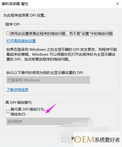 就是在软件的属性面板里面。点击【兼容性】栏目,选择【更改高DPI设置】。在新窗口里面,勾选【替代高DPI缩放行为】缩放执行应用程序,即不适用系统125%放大设置。这样的话系统字体依然是125%大字,设置过这这个软件还是100%小字。