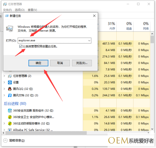 4、在输入框里输入explorer.exe,再勾选上以系统管理权限创建此任务,并点击确定即可。