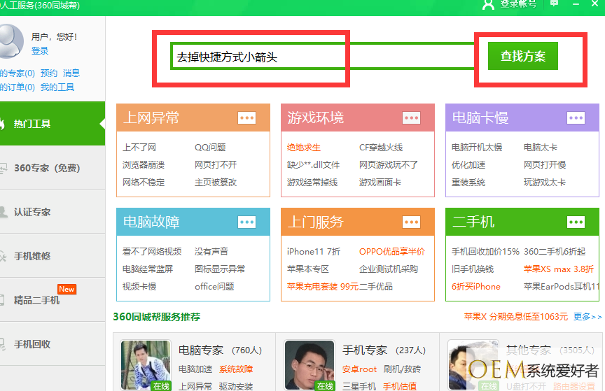 3、在搜索框中输入“去掉快捷方式小箭头”,点击查找方案。