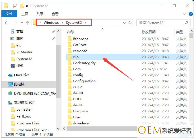 3、如果重启资源管理器问题依旧,打开此电脑,依次打开C:WindowsSystem32 ,在该文件夹查找是否有“clip”文件夹,若没有则新建一个文件夹命名为:clip 即可。