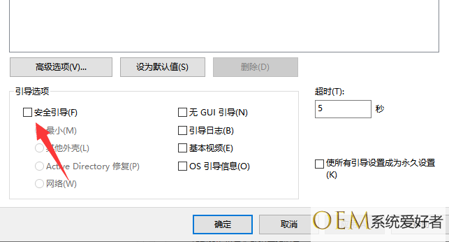 3、在引导选项下点击安全引导,最后点击确定即可。