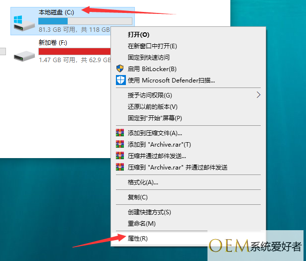 1、选择系统盘右键,点击【属性】。