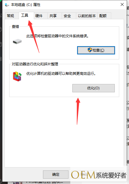 6、点击系统盘属性界面--工具--优化。