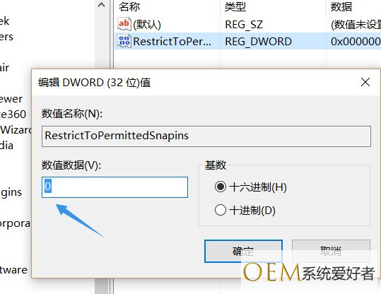 2、在编辑器左侧依次找到HKEY_CURRENT_USERSoftwarePoliciesMicrosoftMMC,然后将RestrictToPermittedSnapins 的值设置为 0;