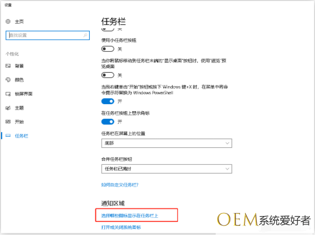 2、在任务栏下,找到在通知区域,点击【选择哪些图标显示在任务栏上】。