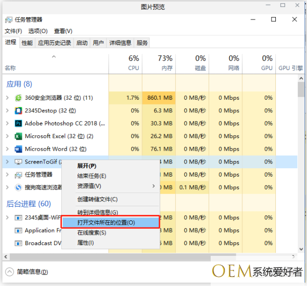 2、此时根据我们第一步得到的进程名可以直接在任务管理器中找到对应的进程。右键可以直达文件所在位置。