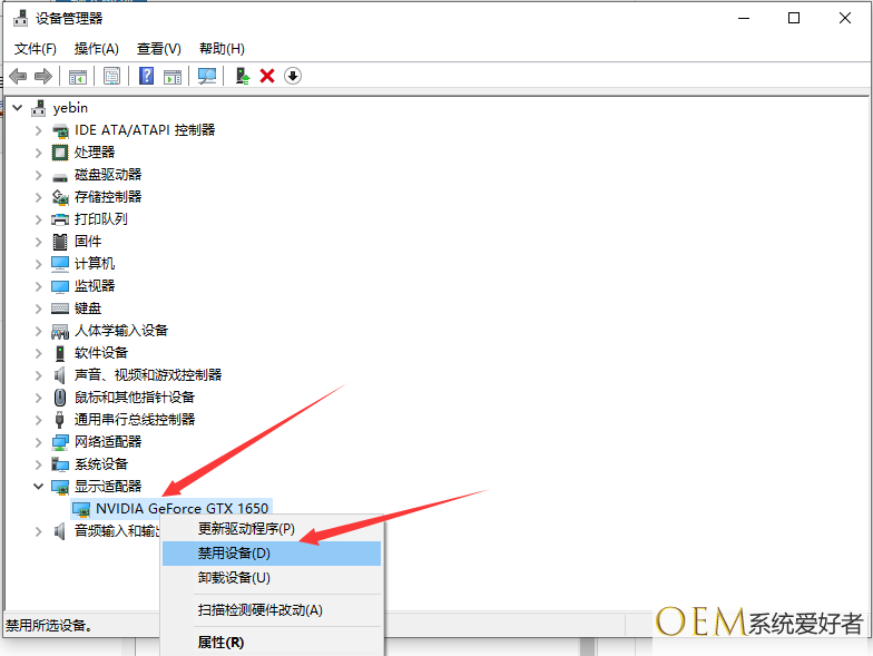 2、找到[NVIDIA图形卡],右键单击以将其禁用,然后重新启用它。