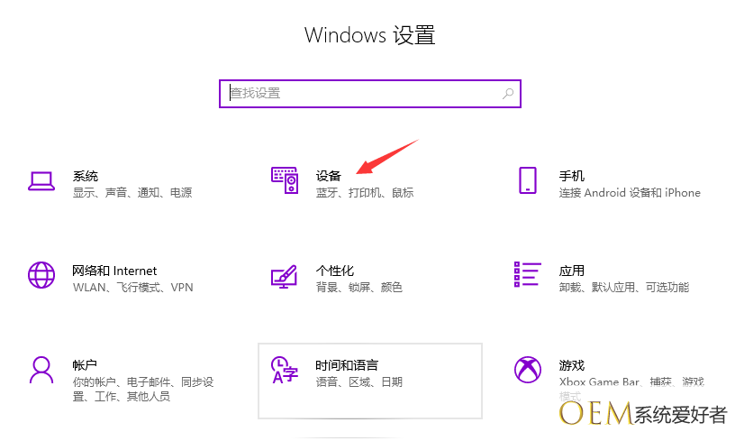1、进入系统后,点击“开始”菜单,选择“设置”。或者输入快捷键“Win+I”进入设置界面,并点击“设备”。