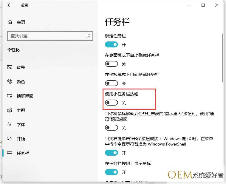 2、在新打开的窗口右侧找到“使用小任务栏按钮”设置项,点击下面的开关。开启后任务栏的图标就会变小。