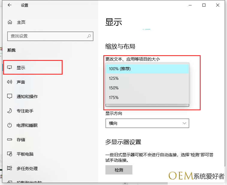 4、在打开的系统设置窗口中,点击左侧边栏的“显示”菜单项,在右侧窗口中找到“更改文件、应用等项目的大小”,然后设置你想放大的倍数即可。这样同样会放大Windows10任务栏的图标,同时也会放大桌面的图标。