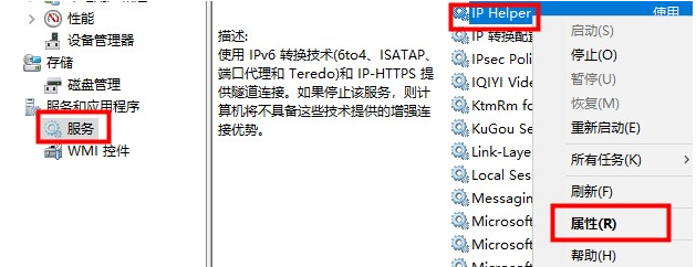 1、右键点击此电脑——选择管理——在左侧菜单选择服务——右侧找到IPHelper——右击选择属性。